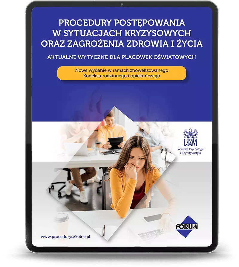 Poradnik prawny Procedury postępowania w sytuacjach kryzysowych oraz zagrożenia zdrowia i życia to pakiet wzorcowych procedur, aktualne dokumentacje, podstawy prawne oraz materiały edukacyjne dla rodziców.